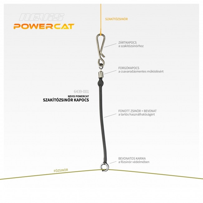 Szakítózsinórok hasznos kiegészítője. Segítségével gyorsan felakasztható a főzsinórunk a fix pontra (pl. faághoz) rögzített szakítózsinórra. Erős és tartós anyagokból készült. Megfelelő szakítózsinórral kombinálva hosszútávon remek kiegészítő a harcsahorgászathoz.