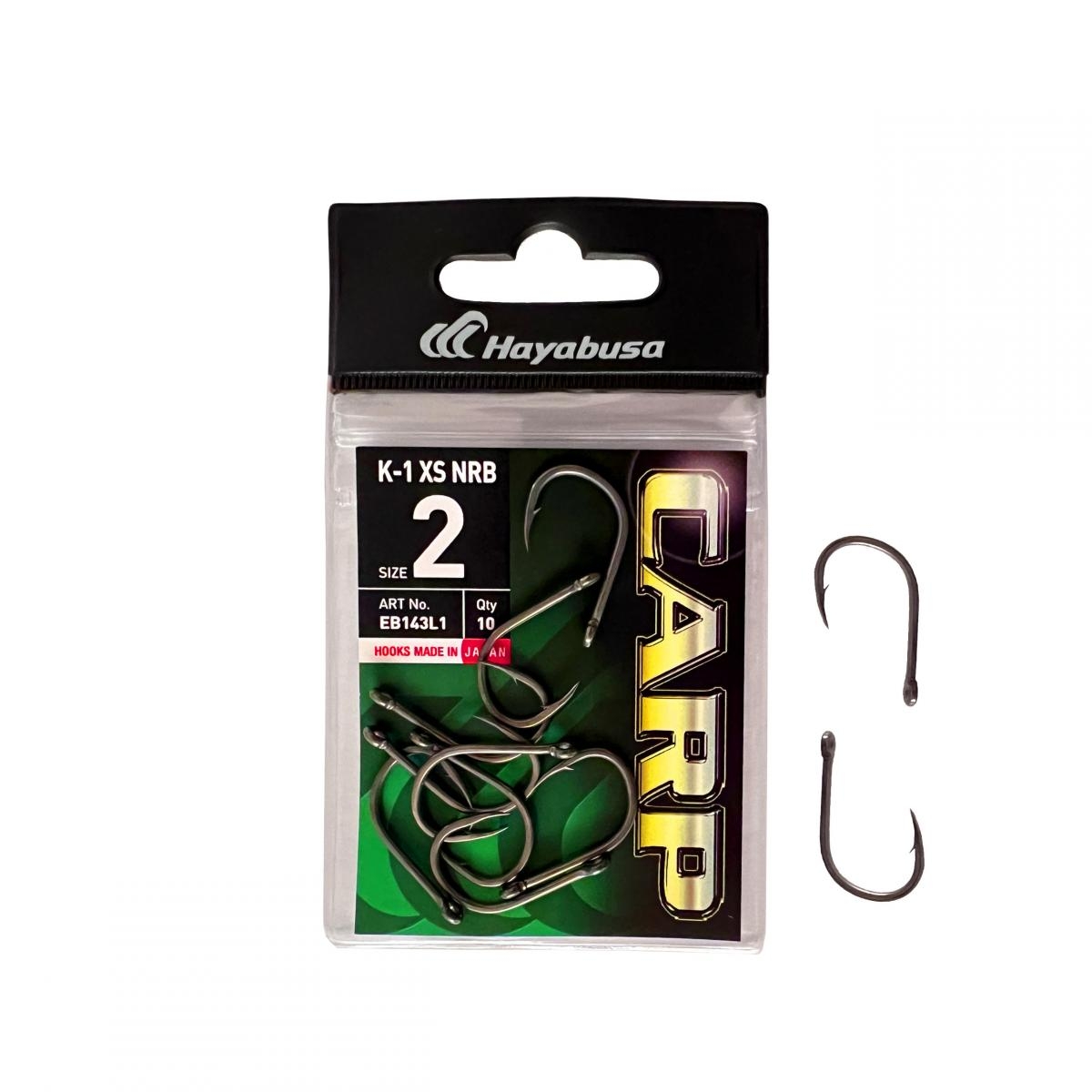 A HAYABUSA népszerű K-1 XS azaz extra-strong(extra erős) sorozata, melyet elsősorban pontyhorgászatra fejlesztettek ki. Kiválóan alkalmazható a hagyományos pontyozó módszerek mindegyikénél, de a bojlis horgászatok során is. Ez az új NRB azaz non reflektív változat kapott egy csillogásmentes fluoro bevonatot. A horog felülete még simább lett ezáltal, így könyebben akad meg a hal szájában, illetve a vízben nem csillan így a halak nem veszik észre, nem kelti fel a gyanujukat. A K-1 XS nagy öblű, kerek formájú, erős, vastaghúsú pontyozó horog, amely ideális a nagyméretű csalikhoz, a pelletes és bojlis technikához, a horog szára közepesen hosszú ezért tűzött kemény illetve puha csalikat és fűzött (a horog öbölbe kötve) csalikat egyaránt használhatunk. A K-1 horogtól kb. 20%-al vastagabb ezért ezt a horgot bátran ajánljuk akadós, köves helyekre, hiszen hegye extra tartós ezért nehéz terepen kitűnően megállja a helyét.