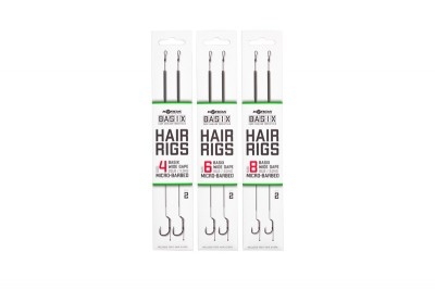 A Korda BASIX Ready Tied Hair Rigs Wide Gape 4 Barbed - hajszállal kötött mikro szakállas kész horogelőke 4-es Wide Gape horoggal, melyek készen állnak a használatra, egyenesen a csomagból, mindössze annyit kell tennie, hogy hozzáad vagy egy csalit vagy waftert, és máris mehet! Ezeket a szerelékeket camo zöld színű BASIX bevonatú előke anyaggal kötik meg, a BASIX Wide Gape horoggal egy kis lehámozott résszel a mozgás lehetővé tétele érdekében, ami növeli az akadási potenciált. A hajszál egy szilikondarabbal van rögzítve, ezzel segít megelőzni a gubancokat, itt a hajszál hosszát optimalizálták a horogcsalik méretéhez, amely megfelel a kiválasztott horog méretének. A 8-as méretet 12 mm-es horogcsalikhoz tervezték, a 6-os méretet egy 15 mm-es, a 4-es méretet egy 18 mm-es horoghoz. Minden szerelékhez több Hair stopper és különféle méretű Extenda stopper tartozik, amelyek lehetővé teszik a hajszál hosszának megváltoztatását, és különböző méretű csalik használatát azokhoz, amelyekhez a szereléket tervezték. A BASIX Hair Rig másik végén van egy hurok és egy BASIX Anti Tangle Sleeve, amely lehetővé teszi, hogy gyorsan és egyszerűen fel lehessen erősíteni a BASIX Lead Clip Leader-hez vagy a BASIX Lead Clip Action Pack szetthez (amely tartalmazza a QC forgócsapokat is).