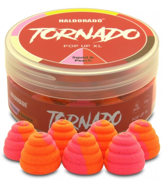 A TORNADO Pop Up XL egy különleges formájú, rendkívül attraktív, főzött, lebegő csali, amely napokig képes a vízben megőrizni formáját és lebegőképességét, miközben folyamatosan áramoltatja ki magából vonzó ízét és aromáját, de nem füstöl"! Tökéletesen használható önmagában is, megemelt előkés csali felkínáláshoz, de más csalik balanszírozásához, lebegtetéséhez ajánlott igazán. Ekkor az alap csali lehet tigrismogyoró, kisebb méretű vagy felezett bojli, nagyobb csalizó pelletek, és kukoricaszem(ek). Méretét tekintve 15 mm. Tapasztalataink azt mutatták, hogy ez a méret kell ahhoz, hogy a fent említett tulajdonságainak tökéletes megfeleljen. Említést érdemel az is, hogy lényegesen masszívabb a Pop Up XL csalik állaga, mint a TORNADO Wafter csaliké, ez a típus egyáltalán nem puhul fel, nem lesz kocsonyás a felszíne. E tulajdonságaiból adódóan ez egy tökéletes nagyhalas csali, eredményesen használható a kivárós, szelektív horgászatokhoz, ahol nem a mennyiség, hanem a méret növelése a cél! Kifejezetten ajánlott szelektív nagyponty- és amurhorgászathoz! Ez a termékcsalád a wafter változattal azonos ízekben kerül forgalomba: Édes Szamóca, Rokfort Sajt, N-butyric & Ananász, Mézeskalács, Mangó, Fokhagyma & Mandula, Puncs & Menta, valamint Tintahal & Barack.