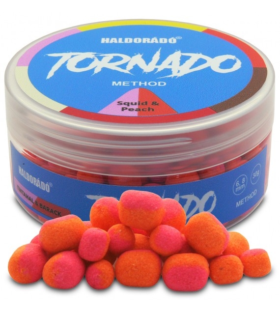 A Tornado Method a nagysikerű Tornado Wafter csalik method horgászathoz optimalizált változata, mely ugyanúgy árasztja magából a szín, és illatanyagokat, mint a nagynevű elődje. Egy tégelyben 6 és 8 mm-es wafter (mérsékelten lebegő) pelletek találhatók meg, a már ismert és bevált Tornado ízekben. Csalitüskés felkínálása immár lehetővé teszi, hogy finomabb horgászatoknál is élvezzük a füstölős csalik előnyeit. Ez a csali nem az egyedi Tornado formát kapta, hanem a klasszikus hengeres method csalikét, mert így érvényesül a legjobban. Lebegőképességére jellemző, hogy a kisebb 7 mm-es, vagy a Fine csalitüskék is elegendőek ahhoz, hogy elsüllyedjenek, és optimális pozícióban várják a kosár közelébe érkező halakat. Az összes Tornado ízben elérhető: Édes Szamóca, Rokfort Sajt, N-butyric & Ananász, Mézeskalács, Mangó, Fokhagyma & Mandula, Puncs & Menta